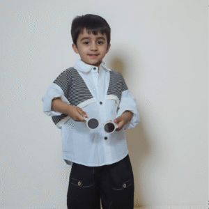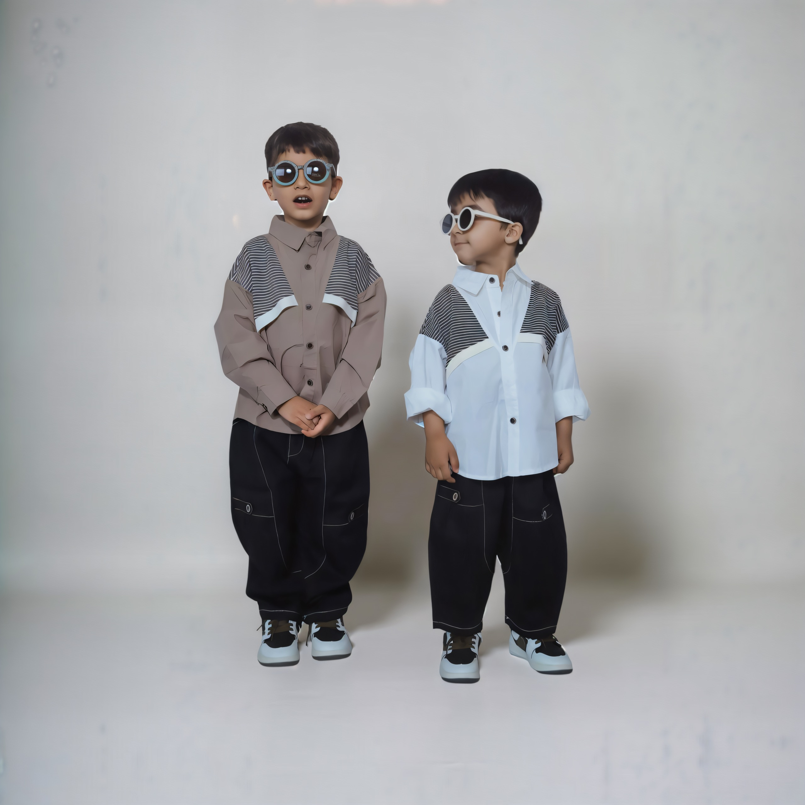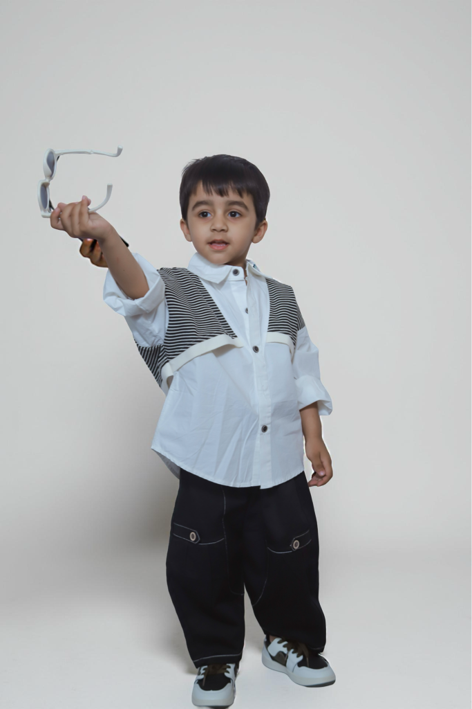 Loose-fit shirt in an airy, cotton weave with a collar, buttons down the front and long sleeves with buttoned cuffs. Knitted striped patches in the front making it a superb formal outfit, with super stylish black joggers.