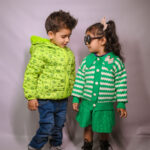 Knitted sweater and skirt set in vibrant green color. Buttons in the front and motif detail on one collar gives a complete festive look to our little girls.
